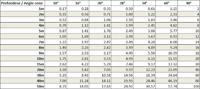 | Tableau de diamètres de cône selon la profondeur et l'angle du cône. |